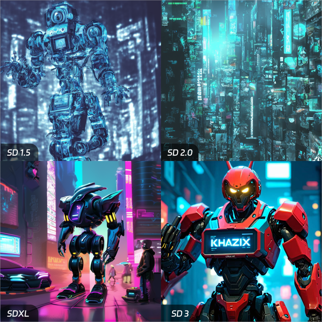 SD1.5:有点像我爸的微信头像。。。 SD2.0:凑合,就是构图雪崩。 SDXL:SDXL是真的好容易画卡通。 SD3:这氛围就到位了。 - 7.最后一个SD3最棒的,文字嵌入。 Cyberpunk style,urban,1 robot,an electronic screen with“ Khazix”(赛博朋克风格,都市,1个机器人,一个带有“卡兹克斯”的电子屏幕)