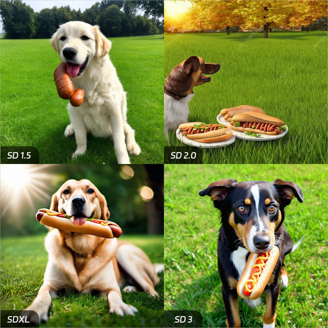 SD1.5:emmmmmm,这怎么成两张了,小猫咪看起来不太高兴啊,挎着个脸,海滩不太美丽雅,阳光呢? SD2.0:不是,小猫怎么从船里长出来了,还有月亮你是怎么回事儿?不是说好的太阳吗。 SDXL:整体还行,但画面有点昏暗,配色不是很舒服。 SD3:王炸!语义理解能力极强,阳光明媚,美丽的海滩,鲜花……关键细节什么的都很好,画面也很和谐。 - 2.再来测一下相对位置关系理解,这个更加考验模型能力。 a dog,hold hot dog,outdoors,grass(一只狗,叼着热狗,户外,草地)