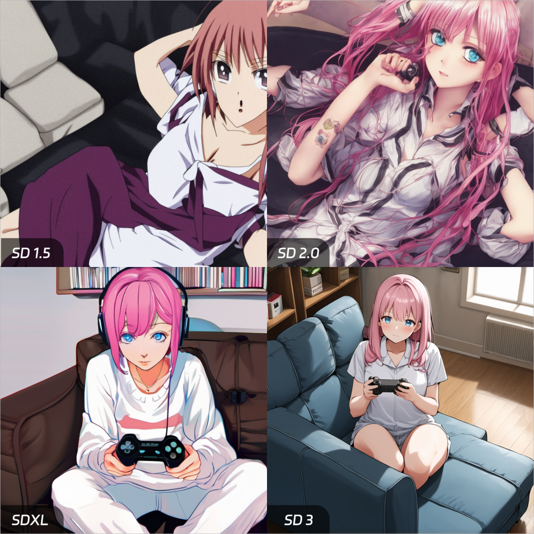 3.测试一下二次元动漫人物。 ((anime style)),1girl, indoors, sitting on the sofa, living room, pink hair, blue eyes, from back, from above, face towards viewer, playing video games, holding controller, white shirt, short, parted lips, anime production(((动漫风格)),1女孩,室内,坐在沙发上,客厅,粉红色的头发,蓝眼睛,从后面,从上面,脸朝向观众,玩电子游戏,拿着手柄玩游戏,白衬衫,短,分开的嘴唇,动漫制作)