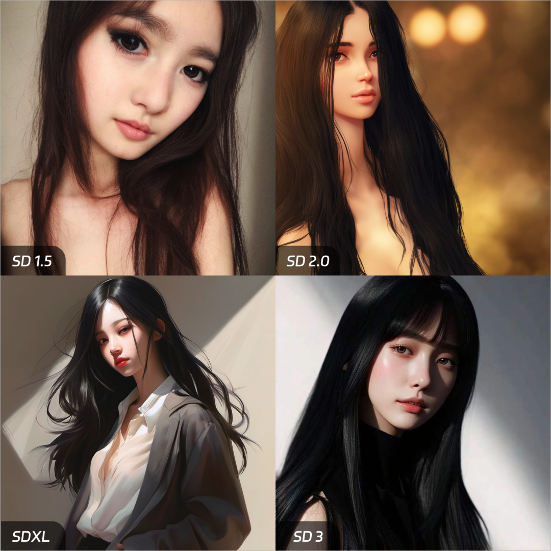 第一时间,我跟我我的小伙伴@祁珏瑜 对比了SD1.5,SD2.0,SDXL,SD3 Medium四个基础模型,来给大家看一下SD这么长时间,直观的进化。也给大家看看,SD3 Medium,有多强。 先说一下测试的大背景。 我们知道对于SD的话,需要很多的提示词,一般SD提示词两部分组成:内容描述提示词+画质描述提示词。 之前SD很烦的是,你必须要加一些冗余的画质提示词,比如best quality, high resolution, 8k之类的,正向反向都得加,不加的话则出图质量会差很多。 那我觉得既然SD3了,你就别欺负前面的弟弟了。 所以我给前三个模型SD1.5,SD2.0,SDXL提示词评测都加了正向画质提示词和反向画质提示词,(后面每一个都加了,为了避免重复就不写出来了) 1.5和2.0 的正向反向画质提示词 best quality, high resolution, 8k,masterpiece, highly detailed, UHD, bad proportions, low resolution, bad, ugly, terrible, render, watermark, logo,