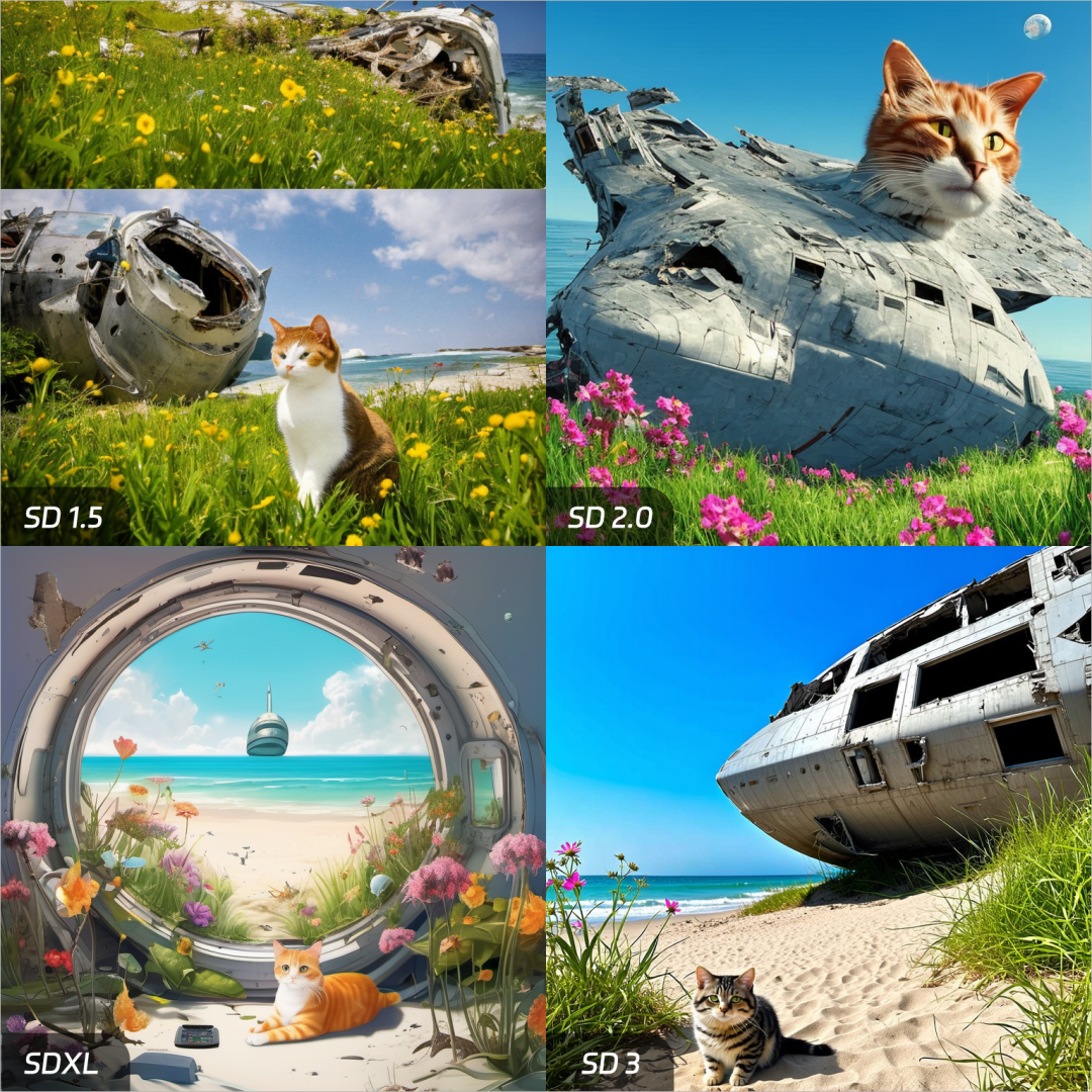 那SD3呢,我不给他加任何的画质提示词,直接裸奔。 所以其实最开始评测是有些不公平的,不过,真正的强者不需要我们的特殊照顾。直接来看效果。 1. 第一组内容提示词,看一下语义理解能力。 a cat,a destroyed badly damaged space ship,beautiful beach,broken windows, grass and flowers grow around,sunny,ocean(一只猫,一艘被摧毁的严重受损的宇宙飞船,美丽的海滩,破碎的窗户,周围长着草和鲜花,阳光明媚,海洋)