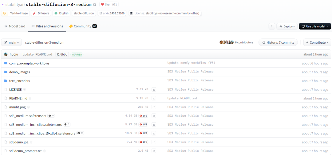 这次给了一个中型版本的SD3,20亿参数,Stable Diffusion 3 Medium。 有些人可能觉得中型不够意思,但是我觉得刚好,毕竟再大了本地也跑不动啊= = 他们官宣的是6月12号,于是我就等啊等,12号从中午等到晚上,终于,等到了Stability AI把模型放出来了。在huggingface上开源。 网址在此:https://huggingface.co/stabilityai/stable-diffusion-3-medium