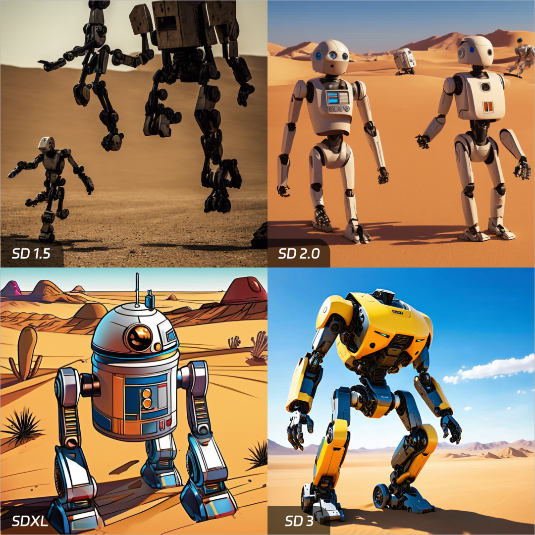 SD1.5:这机器人,是营养不良吧?哈哈哈 还有说好的五颜六色呢? SD2:右边这哥们你的手臂掉了~其他不必多说了,懂得都懂嘿嘿 SDXL:还行,但是这个机器人怎么这么丑呢,三条腿不对称 SD3:同样很Nice,依然是王炸,除了这颜色跟我理解的五颜六色不太一样。 -