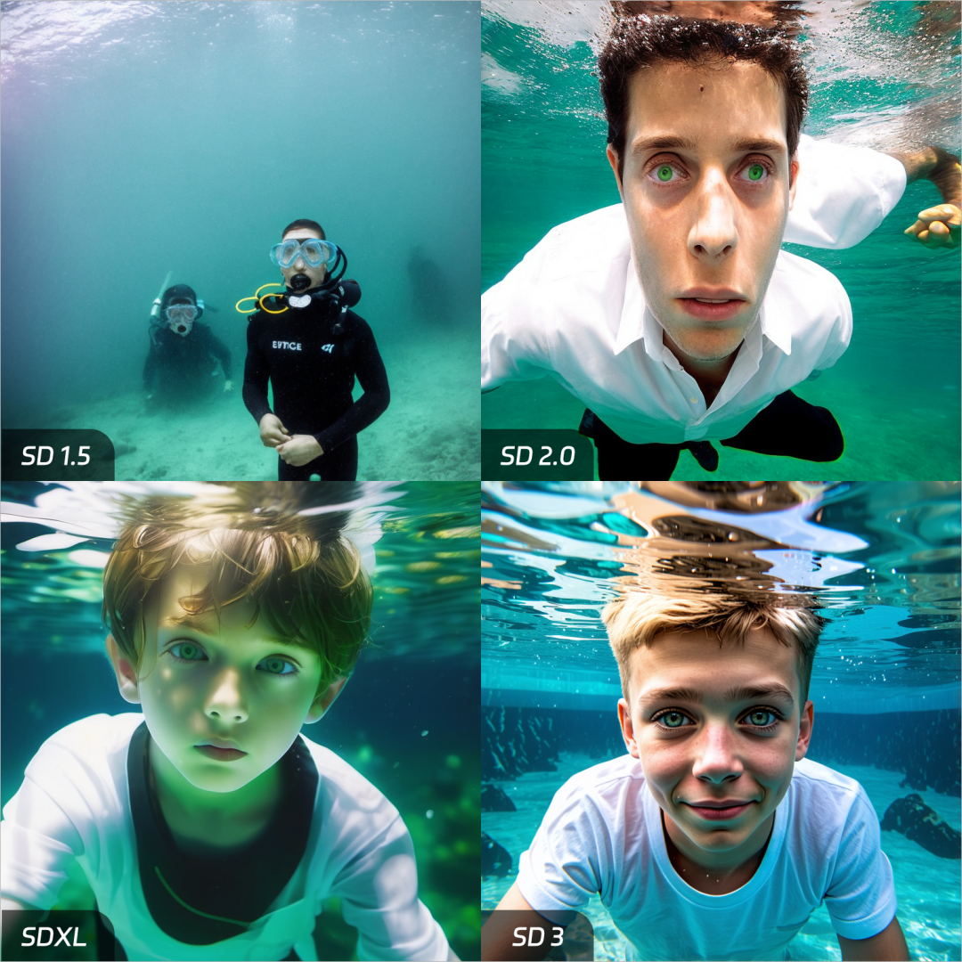 SD1.5:恐怖片。。。 SD 2.0:更恐怖了,有点像泡开的奥特曼。。 SDXL:还可以,凑合能看,就是这绿的啊。 SD3:非常NIce! 再测另一组真人的。