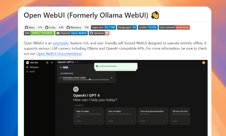 ★Open WebUI是一个支持LLM部署的可扩展、功能丰富、用户友好的自托管WebUI,旨在完全离线操作。它支持多种LLM,包括Ollama和兼容OpenAI的API。Open WebUI提供了简单的Docker或Kubernetes安装方式,支持ollama和cuda标记的镜像,并且可以无缝集成OpenAI兼容的API。