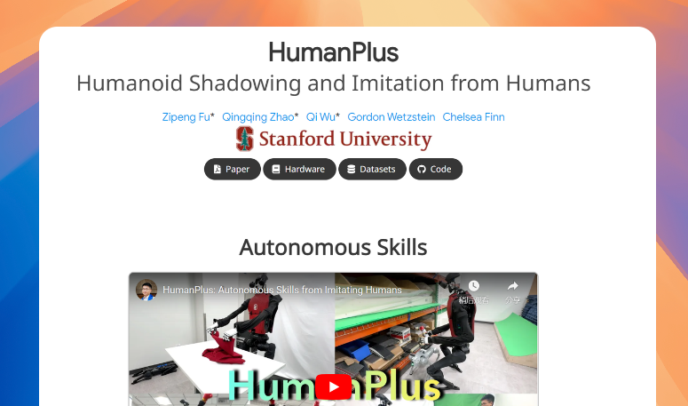 ★斯坦福大学AILab开源HumanPlus项目,致力于开发能够模仿人类动作的仿人机器人,例如仿拳击、弹钢琴、乒乓球、投掷和打字等动作。项目包含了Humanoid Shadowing Transformer (HST) 和 Humanoid Imitation Transformer (HIT) 的实现,并提供了全身姿态估计和相关硬件代码库的指导。HST基于legged_gym和rsl_rl进行模拟中的强化学习,而HIT则基于ACT和Mobile ALOHA仓库进行现实世界中的模仿学习。 |
