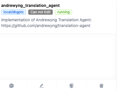 ?支持Qwen2模型 参考: https://qwenlm.github.io/blog/qwen2/ ?支持新版本zhipuaiSDK ?AWEL 实现吴恩达机器翻译智能体 在 dbgpts 中使用 AWEL 实现吴恩达最新开源的机器翻译智能体,无缝支持所有 DB-GPT 的模型并提供并行优化。 1. 通过 dbgpt命令一键安装使用: dbgptappinstallandrewyng-translation-agent-U 2. 稍等10秒钟,在Flow管理页面找到 andrewyng_translation_agentFlow 进行对话
