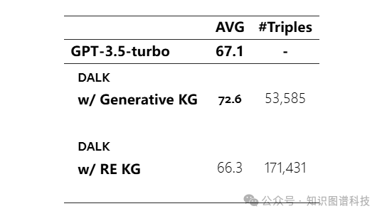表4:生成构建和RE构建的消融研究结果。 表4展示了使用生成构建的知识图和RE构建的知识图进行的消融研究结果。令人惊讶的是,尽管RE方法生成了一个规模更大、三元组更多的知识图,但从中采样的知识竟然导致了ADQA性能的显著下降。在对这两个构建的知识图进行手动检查后,我们发现采用RE构建方法的LLMs更倾向于错误地将关系分配给两个无关的实体,这一点已经被之前的研究Wan等人(2023)揭示。相比之下,生成构建方法专门输出LLMs确信支持的三元组,从而产生一个规模更小但更精确的知识图。在知识图的构建中,覆盖率和准确性之间的权衡突显了LLMs中去噪的重要性。