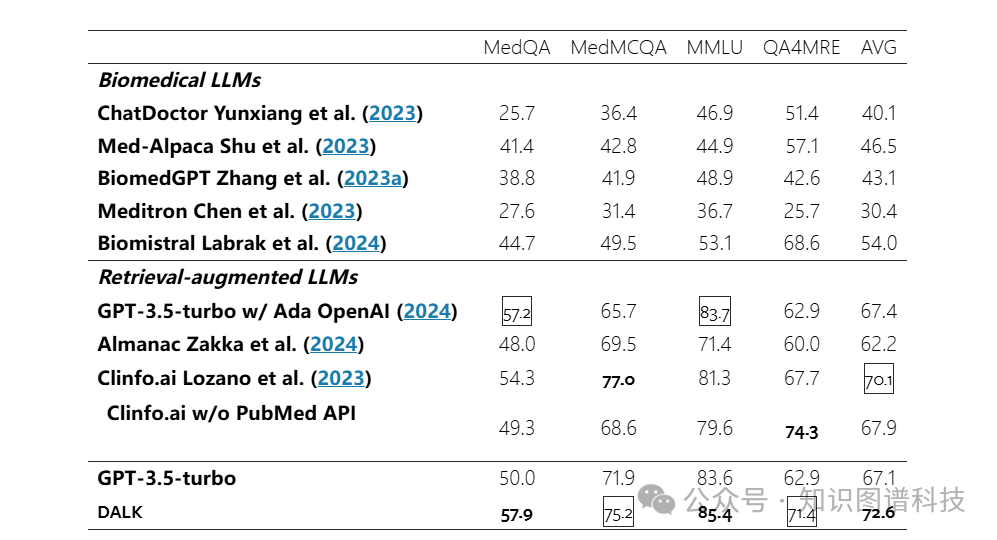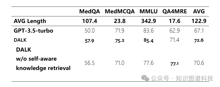 4.3主要结果 表2显示了我们的ADQA基准测试实验结果。我们注意到,在应用动态共增强框架后,DALK的性能超越了其他生物医学LLM和RAG方法的整体性能。它在所有子数据集中始终实现了最佳或次佳的准确性得分,并获得最高的AVG得分。此外,与普通的GPT-3.5-turbo相比,它的显著改进强调了我们方法在领域特定ADQA中的有效性。