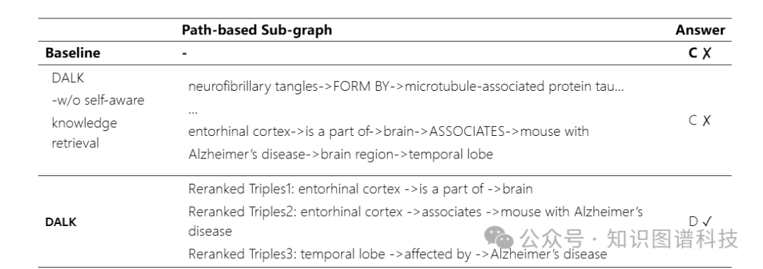 表5:展示DALK有效性的案例。问题是:“对抗阿尔茨海默病神经纤维缠结的大脑区域是:A. 视觉联想区B. 内嗅皮质C. 颞叶D. 外侧膝状体”