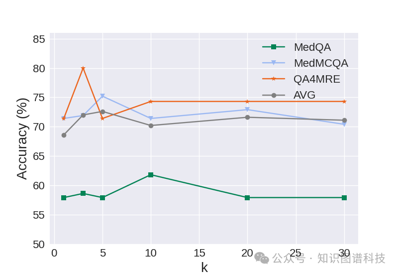 5.2超参数分析在本节中,我们对自我感知检索模块的检索数量 ? 进行超参数分析。我们为 ? 选择了一组值([1,3,5,10,20,30]),并在图4中展示了实验结果。我们展示了在不同 ? 上的MedQA、MedMCQA、QA4MRE和AVG的准确度分数。我们发现当 ? 较小时,递增到它可以提升性能。在出现最佳性能后,持续增加 ? 的值会导致模型准确度得分平稳下降。这个结果表明排名靠前的知识更有帮助,而排名在后面的知识则不太有用,从而成功验证了LLMs进行精细化知识重新排名的能力。