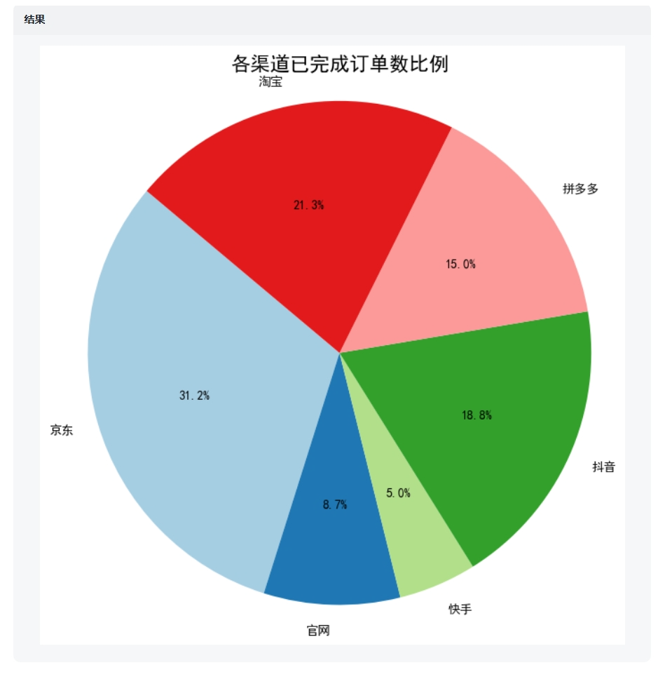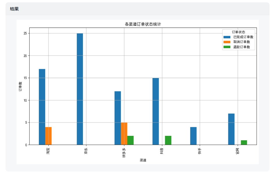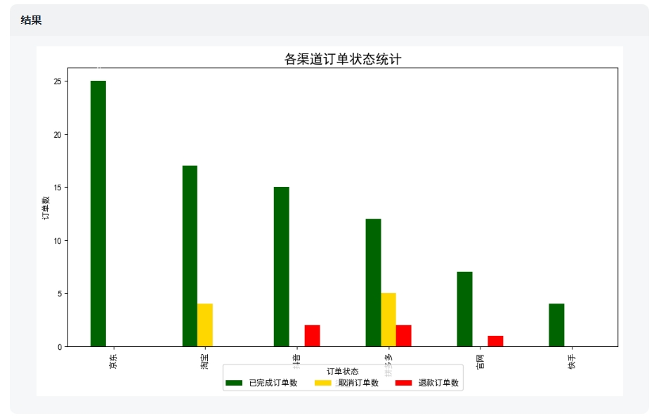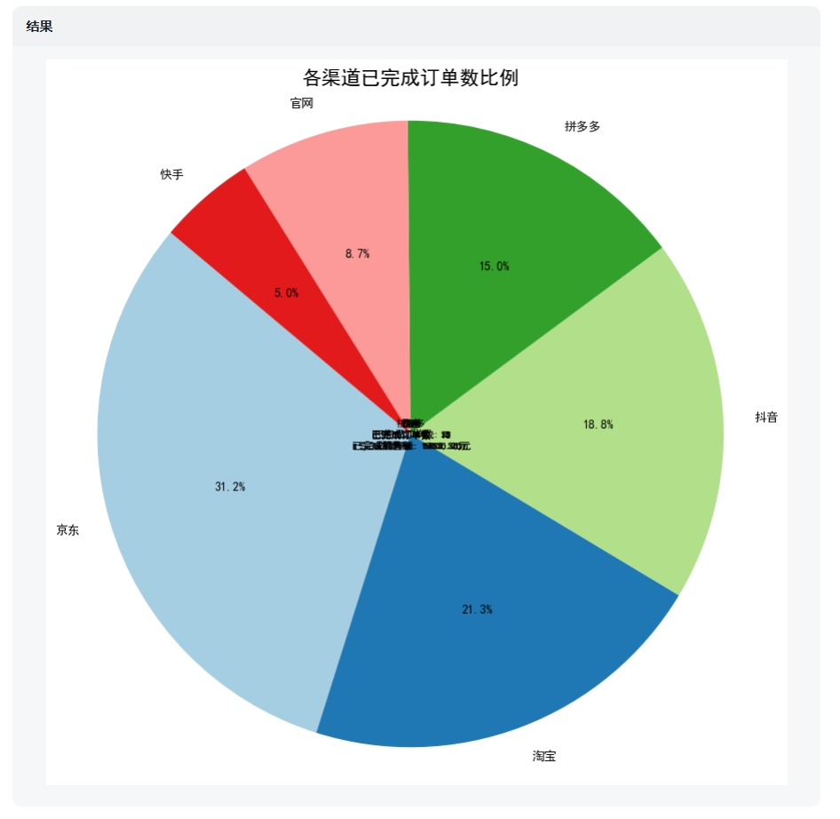 请统计各渠道已完成订单数、取消订单数、退款订单数,然后通过数据+图表+结论的形式呈现分析结果,注意把3个订单数据放在一张图表上呈现。  图表的数据正确,图表类型也吻合,但细节还有待优化。3.横轴的渠道按照“已完成”订单数据的大小,从左到右排列4.修改柱状图的颜色,已完成订单用墨绿色,取消订单用黄色,退款订单用红色6.增大标题的字号  AI完成了提示词里面6点要求中的5点,但没有成功添加数据标签。另外,在图表的元素布局上出现了明显瑕疵,它没有把图例放到标题正下方,而是放在了图表底部,并且图例遮挡了横轴的文字。在图表制作中,添加数据标签是一个基础操作,可能它暂时还没能适配多组数据的图表。请统计各渠道已完成订单数,然后通过数据+饼状图的形式呈现分析结果。  在只有一组数据的情况下,成功添加了数据标签。但是标签还够完善,继续调教。1.每个数据标签添加:该渠道的已完成订单数、已完成的总销售额2.各渠道按已完成订单数多少,从大到小顺时针排列  可以看到,能够调整标签,但是依然存在图表格式问题,AI把添加的标签全部重叠在了图表中间。