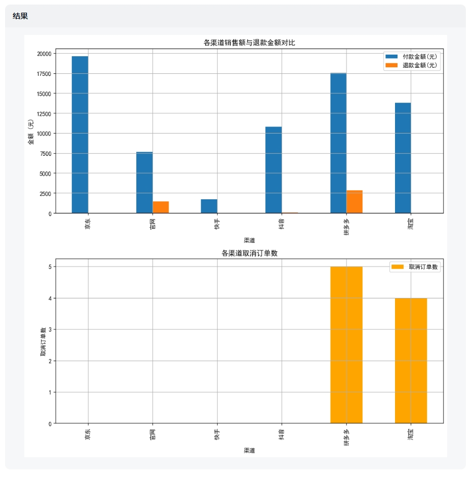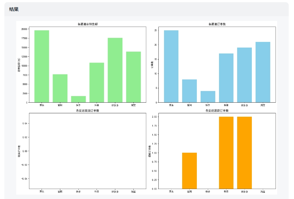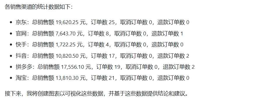 根据我上传的数据,AI提供了分析思路,然后进行逐步分析,最后总结。结合表格里的数据来看,如果是做一份简单的数据报告,这些维度还比较全面。它甚至考虑到了对“退款情况”进行分析,逻辑非常贴近业务需求。2)逐步分析 渠道销售表现