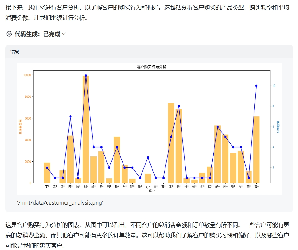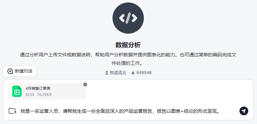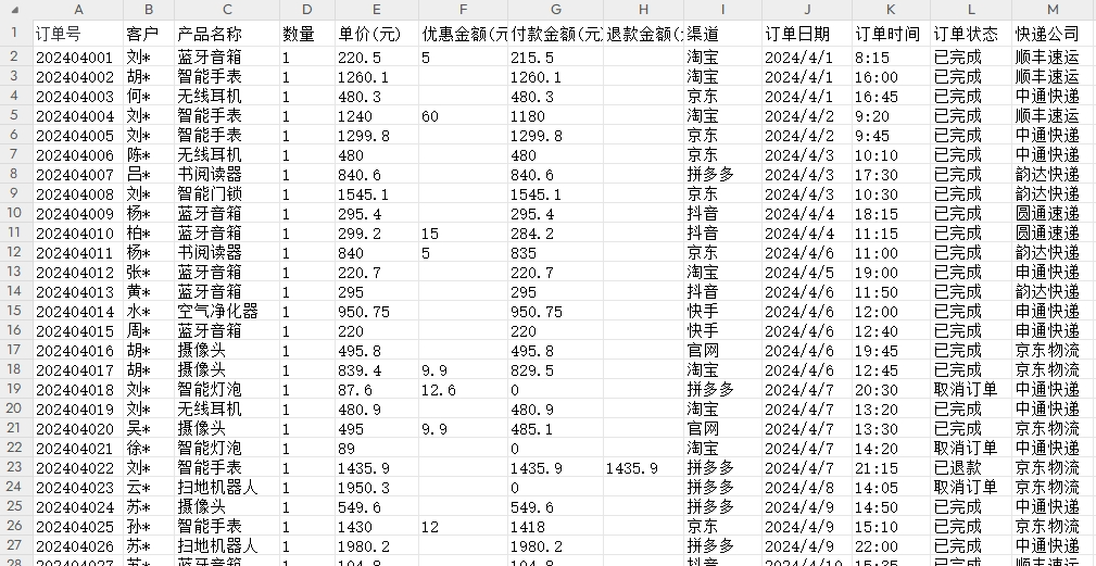 大部分职场人都需要“数据分析”,比如做月度总结报告、分析指标下降的原因等。 最近,发现智谱清言官方出了一个专门做「数据分析」的智能体。我决定试用一下,看能不能替代一个数据分析实习生?  通过以上步骤,测试AI的分析思路、分析逻辑、输出图表、输出结论等方面能力,看它表现如何。文末附上了本次AI对话链接,可以通过链接查看完整的使用过程。 首先,我用AI随机生成了一份某电商公司在2024年4月的销售订单表,保存到Excel。表格里共13列94行数据,包含客户、产品名称、数量、单价、优惠金额、付款金额、退款金额、渠道、订单日期、订单状态等主要字段。