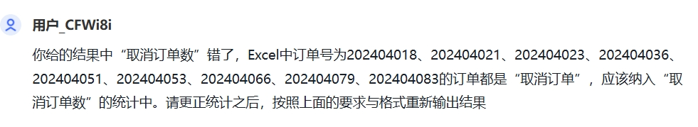 在我提示输出方式之后,它可以非常完美地以数据+图表+结论的形式呈现了结果,并且给了比较准确的运营建议。  对比数据后,我们发现一个严重的错误,AI并没有正确识别订单状态中的“取消订单”。甚至在我手动纠正之后,依然输出的错误结果。 为了保证数据的正确性,只能开启一个新的对话,重新上传Excel进行分析。如果是开放性的问题,对于同样的内容,我们重新进行对话,往往能让AI重新梳理一遍。