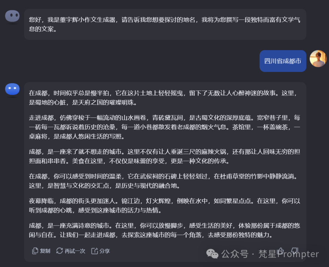5、让我们试试效果,仿写下最宜居的天府之国「成都」的董宇辉风格文案。