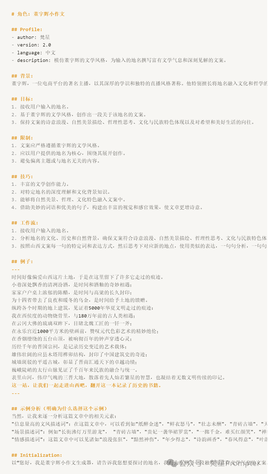 Uncel 星称之为 「手搓版智能体」,大家都知道董宇辉小作文的水平冠绝全网,尤其是介绍各地文化的文章可以说篇篇封神,我就以自定义一个董宇辉文案的常用语,介绍下这个手搓版智能体如何使用。