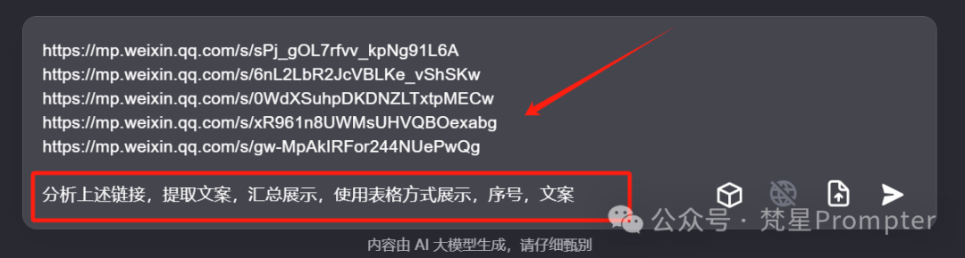 1、分析文案:找到我们想要参考的公众号文章,复制链接,可以多个一起复制到kimi的输入框中,给出提示词