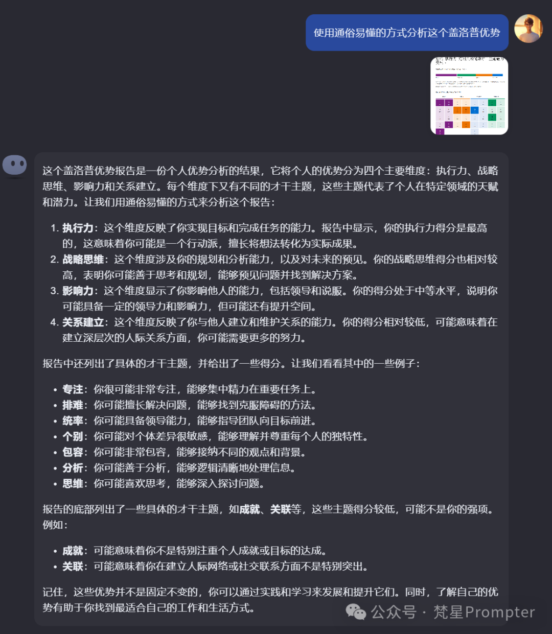 通常解读盖洛普优势,需要找专业的教练来分析和解读。Kimi 不仅仅可以精准的识别出图片的内容,还能给出一定的分析指导,这简直让我头皮发麻。