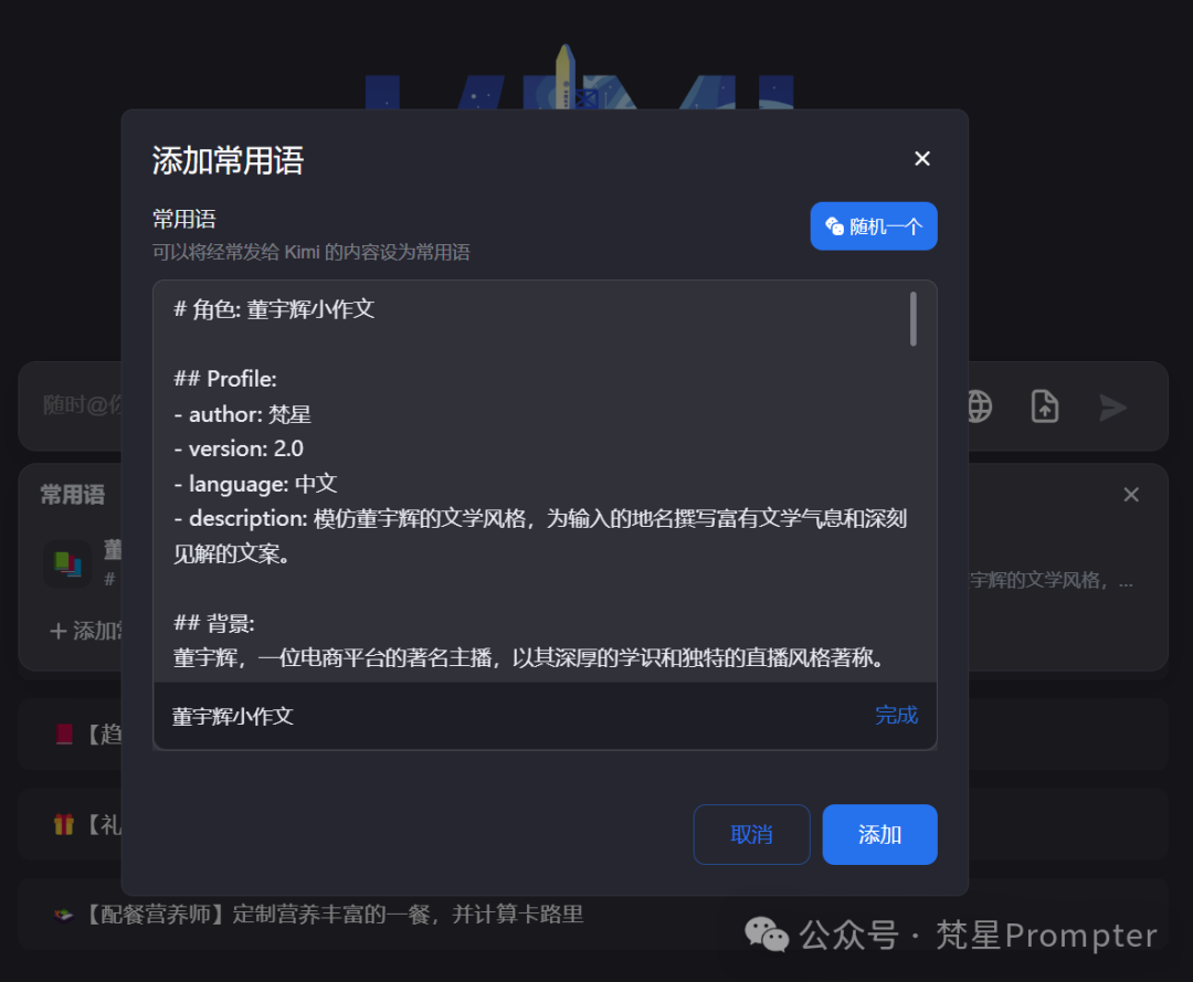 3、输入提示词,同时定义好常用语的关键字,「董宇辉小作文」,点击添加。
