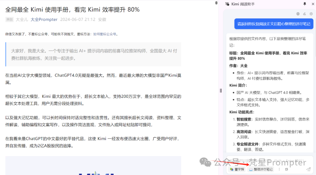 平时大家看到好的文章,是不是都想分析文章的结构和写作技巧,以大全老师 写的「全网最全 Kimi 使用手册,看完 Kimi 效率提升 80%」为例,让 Kimi 帮我们总结下吧。