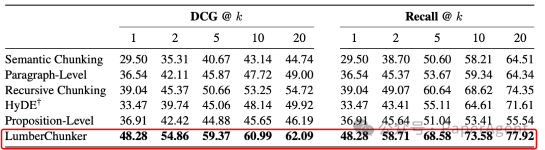 实验结果表明,LumberChunker在检索性能上优于其他竞争性基线,特别是在DCG@20指标上,比最接近的竞争者(循环分块:Recursive Chunking)高出7.37%;其它的竞争者分别是:语义分块:Semantic Chunking、段落级:Paragraph-Level、HyDE、命题级:Proposition-Level