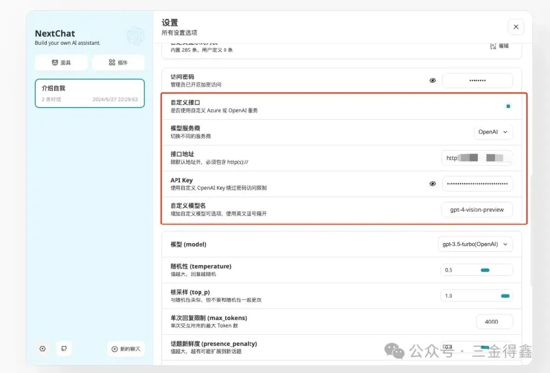 测试 Key复制好之后,我们可以在 NextChat 上进行测试,修改红框中的配置项,其中接口地址就是 One API 的服务地址:
