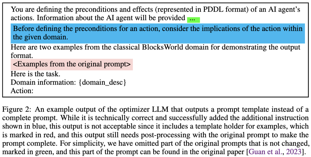 改进应关注于常见的提示部分,而不是从数据点到数据点变化的情景特定提示。例如,在为 PDDL 生成公式化的任务中,最常见的建议之一是提供更多关于 LLM 试图生成特定领域的具体信息以及关于该领域背景的更详细知识。但是,因为我们要获得一个足够通用的提示来解决所有的 PDDL 公式化生成问题,这样的更新不应该发生。