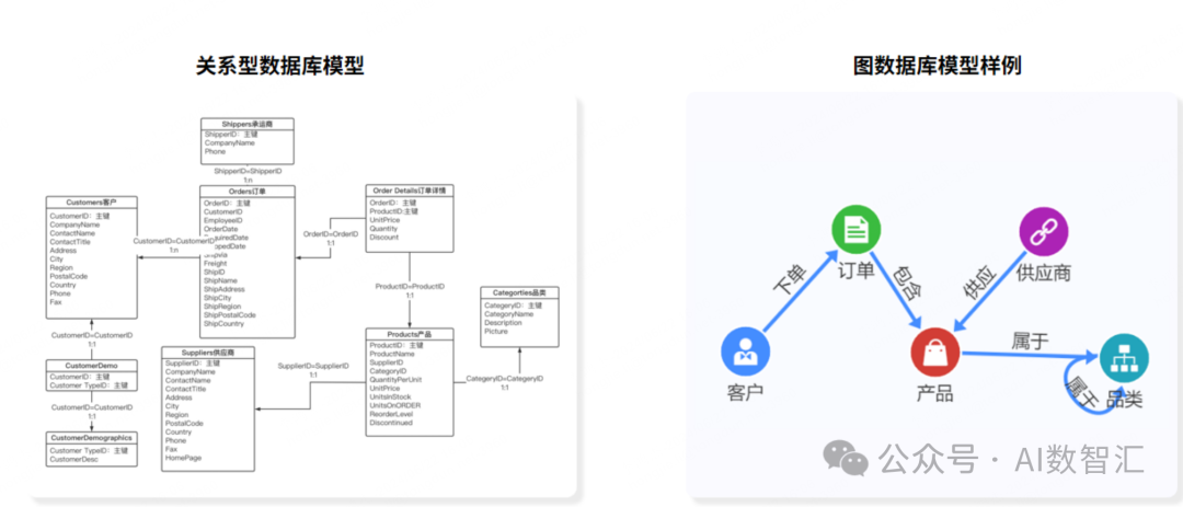 如上图所示,表示客户、订单、产品、供应商之间的关系,明显看出,图数据库模型以“人脑思维”的方式,相较关系型数据库复杂的模型结构,数据模型复杂度极大降低,不管是业务人员还是技术人员都能轻易地理解,业务与技术的沟通效率得到了极大提升。 知识图谱技术体系(一)|知识表示与知识建模