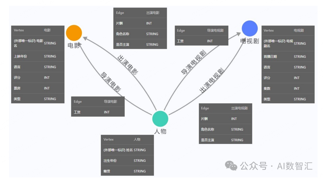 图模型属性图与RDF通常在使用图数据库时,需要对数据依据业务需求构建响应的图模型,如下图所示,为电影知识图谱的图模型,其为属性图。图模型主要包含属性图、RDF图两种。