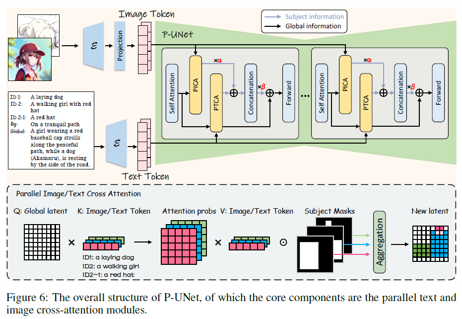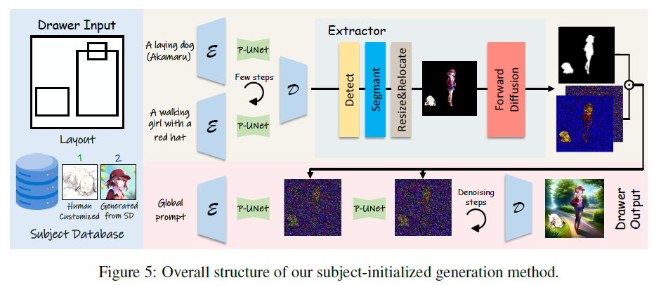 此外,我们在绘画器中引入了并行unet (P-UNet),它利用两个并行交叉注意模块分别通过文本和图像嵌入来增强潜在主题特征。为了进一步解决SD在理解长提示方面的局限性,以及在生成过程中丢失和错误融合受试者的问题,我们在绘画器中引入了主题初始化生成方法。
