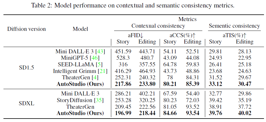 我们在CMIGBench上使用选定的基线模型对AutoStudio进行了全面的评估。在TheaterGen的基础上,我们选择了定量指标r échet Inception 距离(aFID)和平均字符字符相似度(aCCS)来评估上下文一致性,平均文本图像相似度(aTIS)来评估被试之间的语义一致性。结果表明,AutoStudio在所有指标上都明显优于以前的方法。这些定量实验结果证明了我们的方法在多回合交互中生成一致图像的优势。