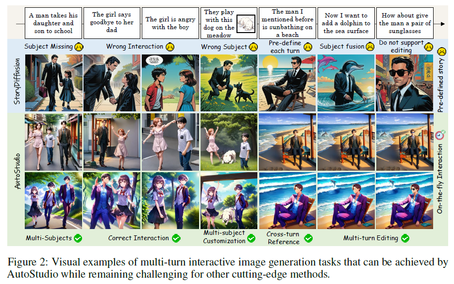 在现实应用中,用户通常需要以交互方式生成一系列图像,如开放式故事生成和多主题的多回合编辑。然而,当前的方法在面对不同的用户指令(如定制、编辑和广泛的交叉引用)时,在保持跨多个主题的一致性方面遇到困难。