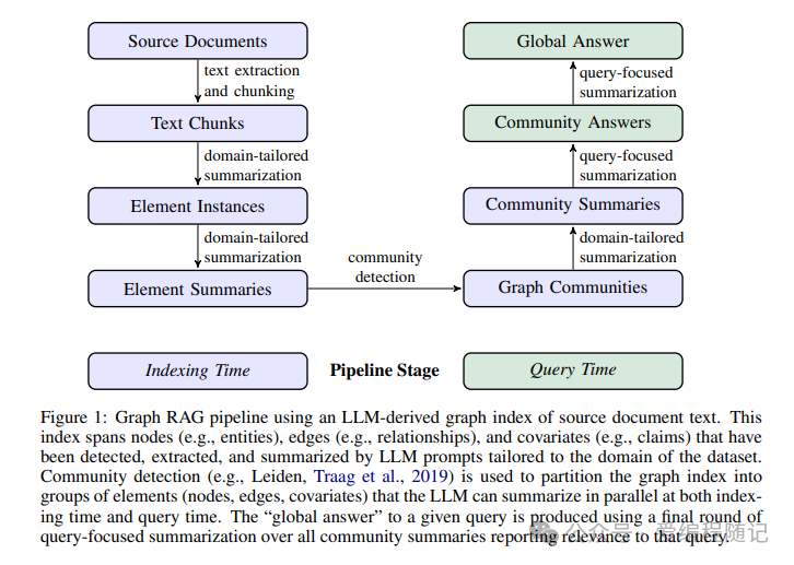 使用由大型语言模型(LLM)派生的源文档文本的图索引的Graph RAG流程。这个索引涵盖了节点(例如实体)、边(例如关系)以及协变量(例如声明),这些元素已经被为数据集领域定制的LLM提示检测、提取和总结。