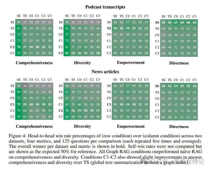 使用两个真实世界的数据集(播客文稿和新闻文章)来评估Graph RAG方法,并与 Naive RAG和全局文本摘要方法进行比较。评估指标包括全面性、多样性和授权性(Empowerment)。Graph RAG在全面性和多样性方面显著优于Naive RAG基线,并且在较低的令牌成本下与源文本的全局摘要方法相比表现出有利的性能。