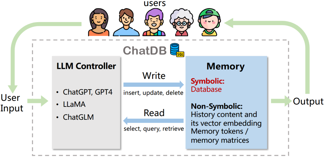 图7:ChatDB 的整体工作流,聚焦于利用数据库作为符号记忆库增强大语言模型