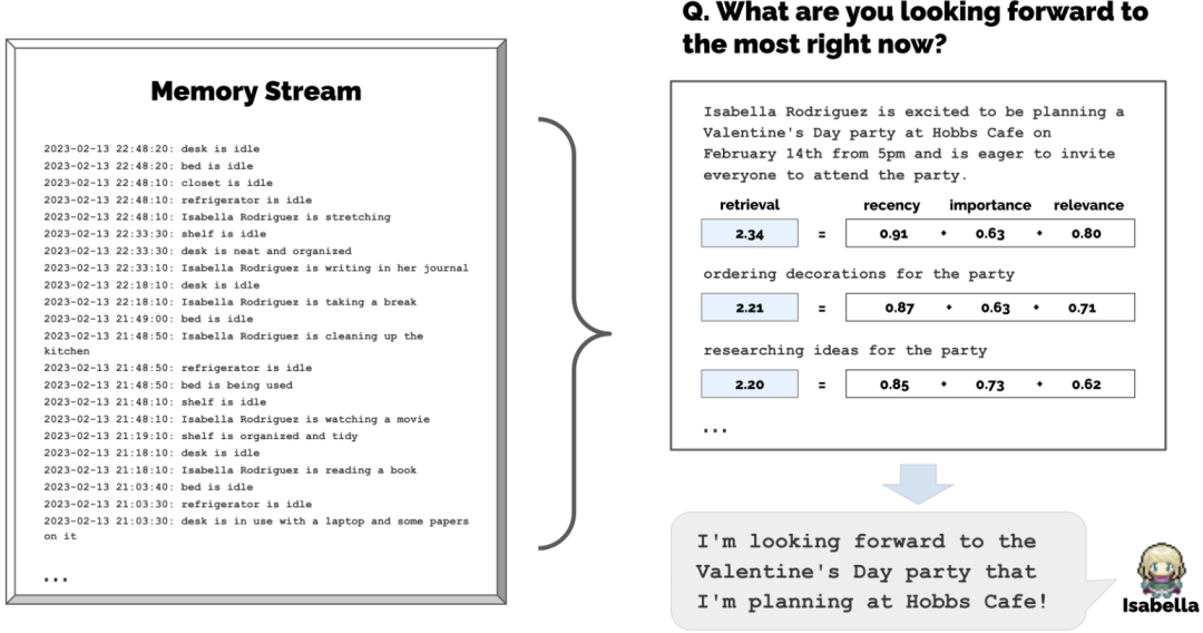 • 重要性则是根据智能体对记忆内容的重要性评价来分配分数。这允许智能体区分哪些记忹是关键的核心记忆,哪些则是可有可无的普通记忆。