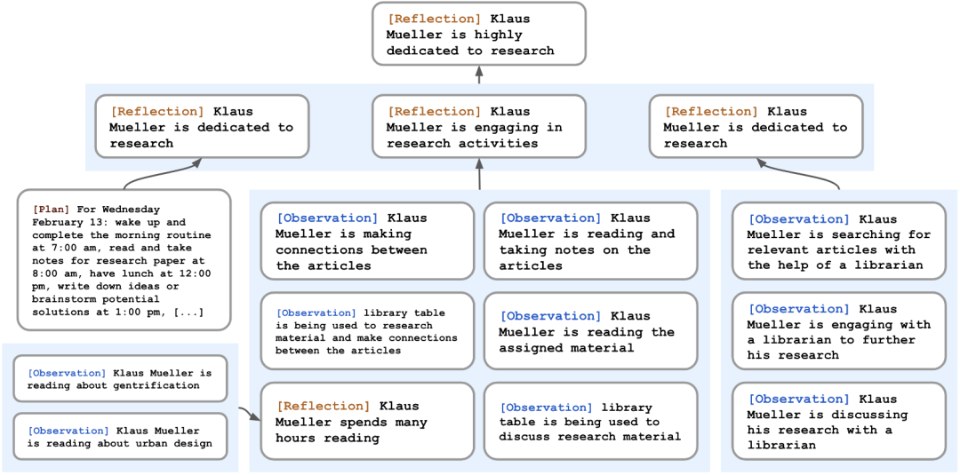 AI-town 在其智能体设计中采取了一种创新性的反思机制,进一步提升了智能体处理信息和做出决策的深度。这个机制不仅仅停留在简单的观察层面,而是将这些观察转化为在特定条件下的更抽象、更高阶的反思。如图6所展示的,智能体 Klaus Mueller 的记忆被构建成一棵反思树,其中叶节点代表对世界的直接观察,而这些观察经过层层递归的总结和综合,最终形成了表达 Klaus 高阶自我观念的节点,即他对研究工作的高度投入与专注。