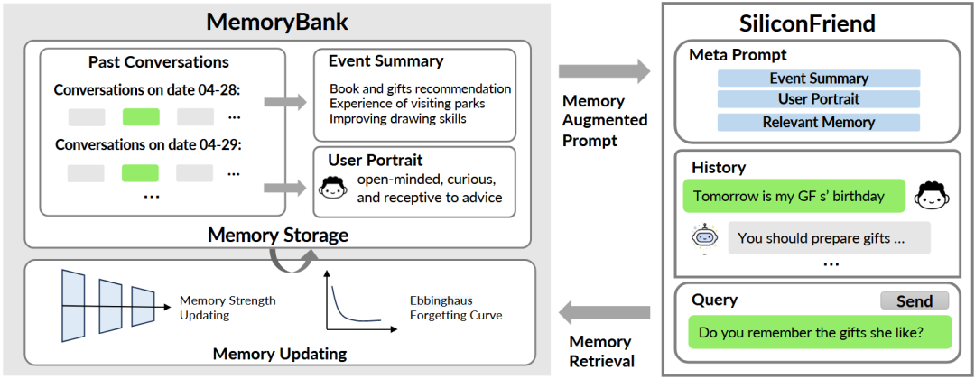 图4:MemoryBank 的整体架构以及 MemoryBank 增强的人工智能伙伴—SiliconFriend