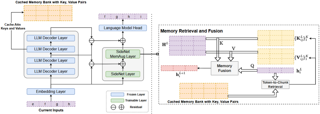 此外,LongMEM 还引入了一个可训练的边缘网络(SideNet),以及残差连接来融合历史信息。边缘网络专门用来处理和整合来自记忆库的信息,而残巻连接则帮助模型在保持前向传播的同时,加入更多历史上下文。这种结构不仅解决了记忆陈旧的问题,还通过扩展Transformer模型的输入上下文长度,进一步提高了模型对长期依赖信息的处理能力。
