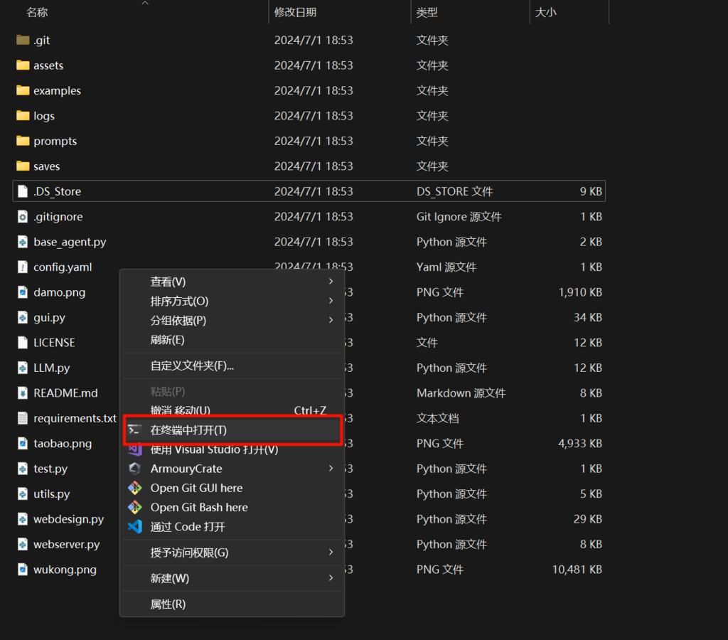 接下来,开始拉取该项目所需依赖,我们进入项目的文件夹,在该文件夹内打开终端。
