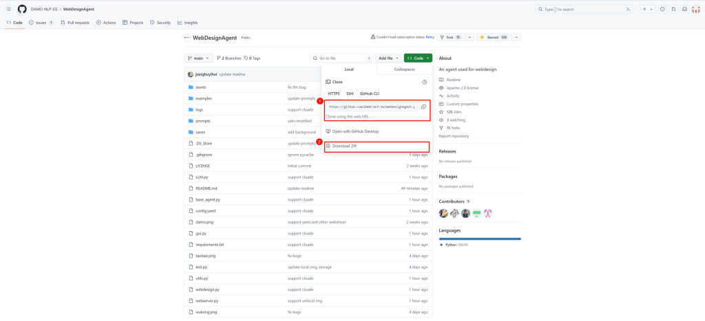 我们进入WebDesignAgentGitHub页面拉取该项目,可以分为命令拉取或者下载压缩包(按照实际情况二选一)。