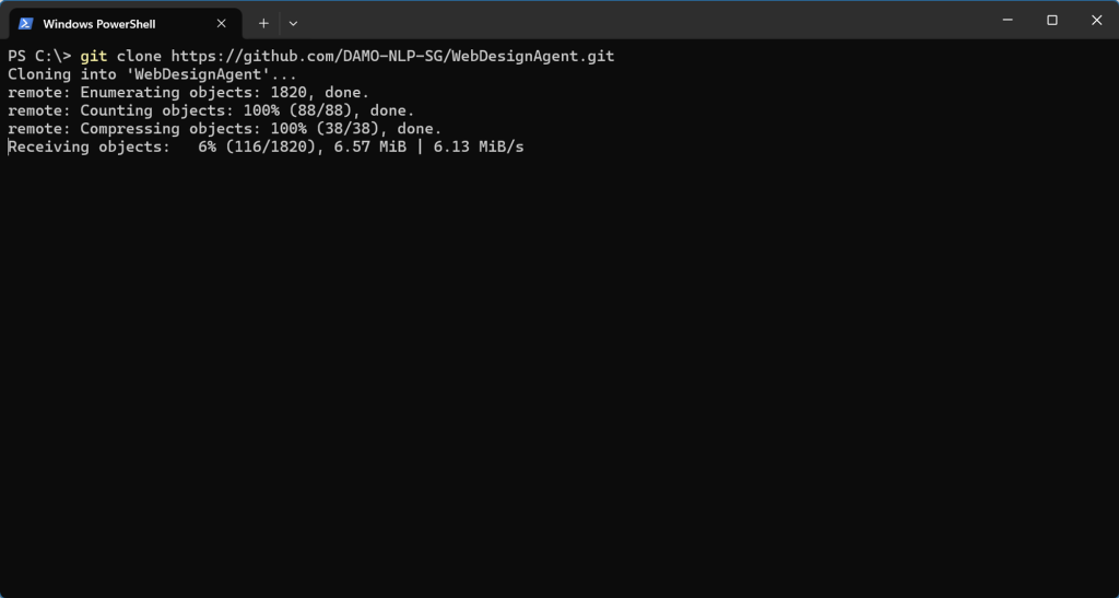 1. 命令拉取:以Windows为例,我们用CMD命令打开终端或打开Power shell,在终端内输入以下命令开始拉取该项目。