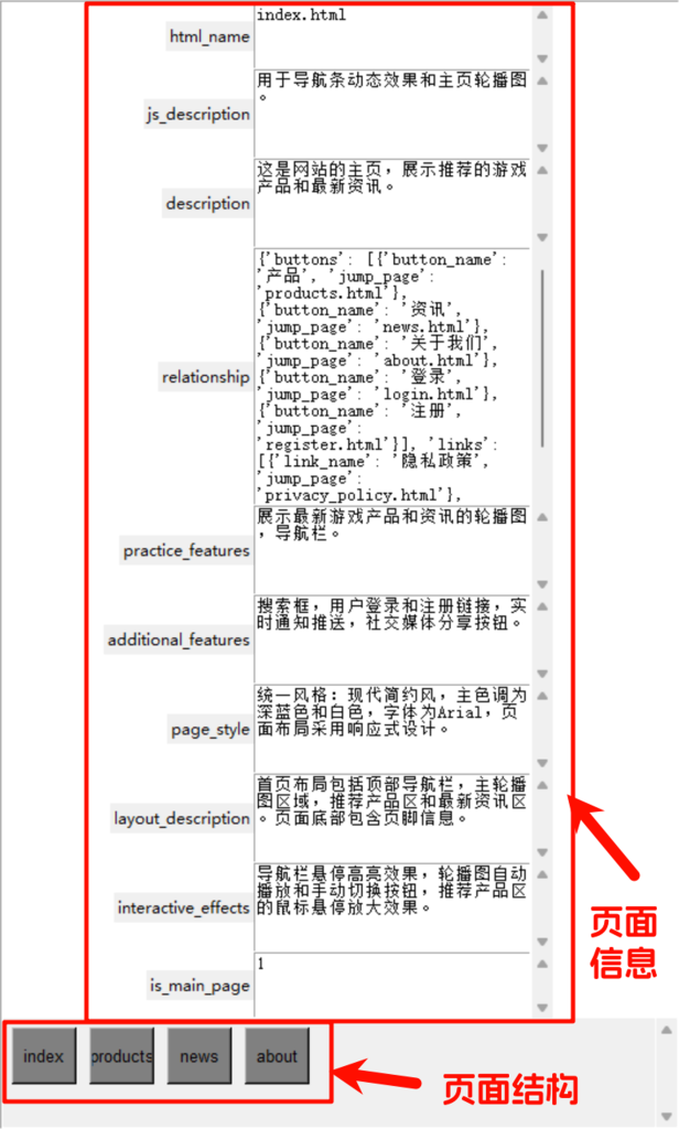 基础信息填写完之后,点击Plan按钮,生成一个页面结构(类似产品原型),可以对于这个结构进行优化(修改),下面生成的四个小按钮就是页面,然后点击这些按钮,就可以得到上面的页面信息,比如:我现在点击的index按钮 那么上面就是index页的信息。