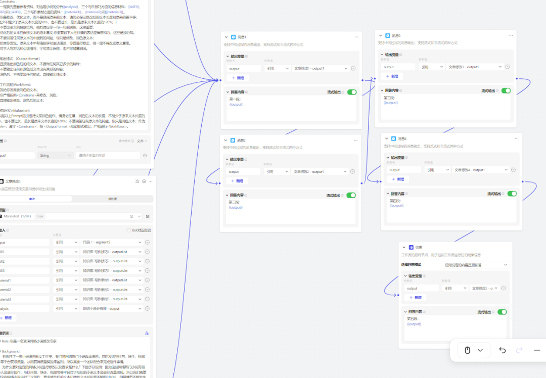 ingFang SC", "Hiragino Sans GB", "Microsoft YaHei UI", "Microsoft YaHei", Arial, sans-serif;letter-spacing: 0.544px;outline: 0px;color: rgb(0, 128, 255);">07 最后新建4个消息节点,将前面5个AI大模型输出的内容与结束节点串联起来,4个消息节点和1个结束节点,分别输出一段改写文本。 这么做是因为,经过测试发现,COZE没办法一次性输出多于600字的内容,所以就把文本分5次发出来。