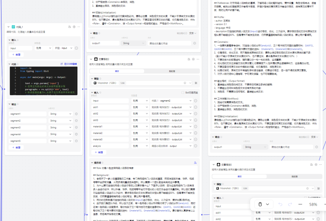 ingFang SC", "Hiragino Sans GB", "Microsoft YaHei UI", "Microsoft YaHei", Arial, sans-serif;letter-spacing: 0.544px;outline: 0px;color: rgb(0, 128, 255);">05 在接下来的代码节点,将用户输入的文本input,以###符号为分界线(需要用户提前自行设置好),拆分为5个文本。 并分别输出为segment1、segment2、segment3、segment4、segment5 ingFang SC", "Hiragino Sans GB", "Microsoft YaHei UI", "Microsoft YaHei", Arial, sans-serif;letter-spacing: 0.544px;outline: 0px;color: rgb(0, 128, 255);">06 添加5个AI大模型节点,将前面分割好的segment1、segment2、segment3、segment4、segment5分别和6个知识库输出结果一起输入进去。 通过prompt,参考6个知识库资料,然后根据我们设置的规则来改写文章,最后输出。 注意:prompt里面的变量名要和输入的一致