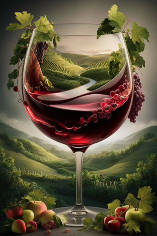 可以具体化成“这是一幅令人惊叹,充满想象力的3D插画。画中的酒杯装满了浓郁的红酒。酒杯中的葡萄酒呈现出山峦起伏、葡萄园以及葡萄、苹果和草莓果园的景色。葡萄酒仿佛从杯中流出,将自然与液体完美地融合在一起。画面整体氛围宁静,光线柔和,葡萄酒与周围景观相得益彰。”