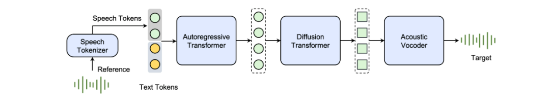 随后,Seed-TTS的自回归语言模型根据输入的文本和语音tokens生成目标语音的tokens序列。这一过程依赖于模型对语言结构和语音特性的深入理解,确保生成的语音tokens序列在语义和语法上与输入文本高度匹配。