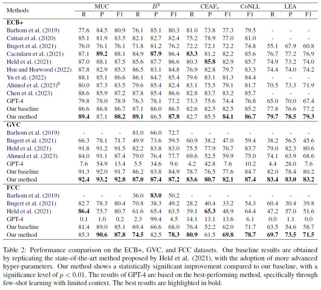 结果表明,使用少量示例学习和包含提及的句子作为上下文的方法(FewMIS)可以使GPT-4达到最佳性能,但仅能达到与基于词形匹配的方法相当的结果。同时,使用全文本作为上下文会导致性能显著下降。此外,零样本学习表现出更高的召回率但显著较低的精度。研究还发现,GPT-4在区分相似但非指代性事件方面存在局限性,而在基于语义的显著叙述差异的指代性事件方面也存在困难。