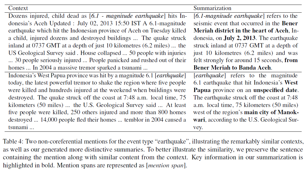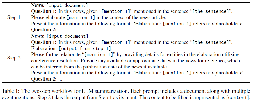 在第一步中,我们指示LLM代理“详细说明”事件提及,而不是传统的“总结”指令。术语“阐述”意味着一种基于提及词本身概念的解释行为,强调来自文档上下文的细节支持。这表明LLM可以自动从上下文中选择任何相关的细节来支持这种解释,包括上下文单词、实体提及和事件提及。这提供了一种标准化和可行的方式来理解事件,利用LLM的内在知识和上下文理解能力,而不需要强加给LLM遵守复杂的规则。